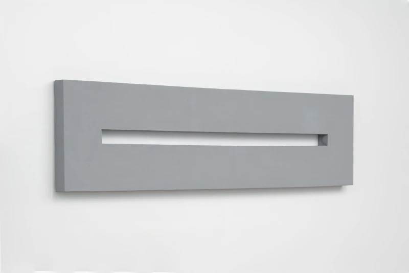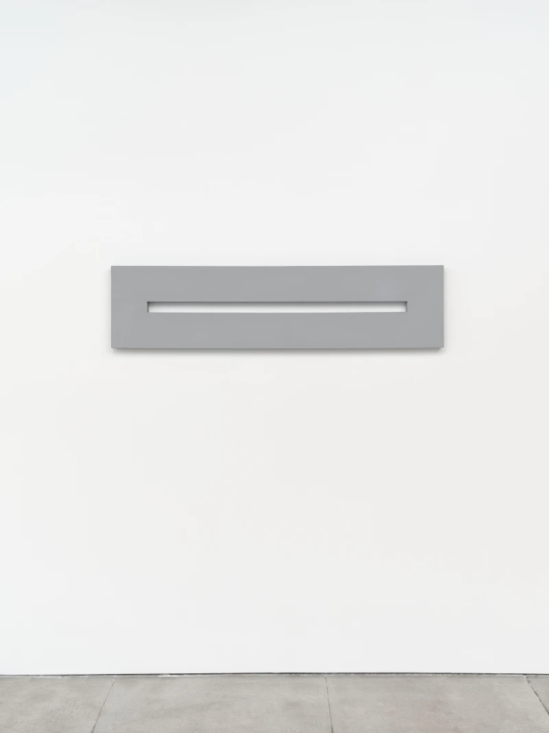 Alan Charlton had his first exhibition with Konrad Fischer in 1972, when he was twenty-four years old. He has been working ever since in steadfast dedication to the painting of gray monochromes on standardized, shaped, and multi-paneled canvases. Grounded in the register of the real, his work engages with and absorbs its surroundings. They, too, are emptied out of information, simultaneously containers of the infinite, and flat executions of slapstick semiotics gesturing towards the urban and the industrial. For example, five gray panels, Untitled (May 1977), fold interior and exterior, like the poured concrete sidewalk from which McBride’s works were pulled and which is visible through the gallery door.
