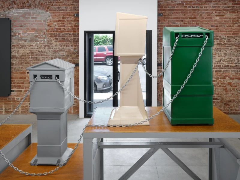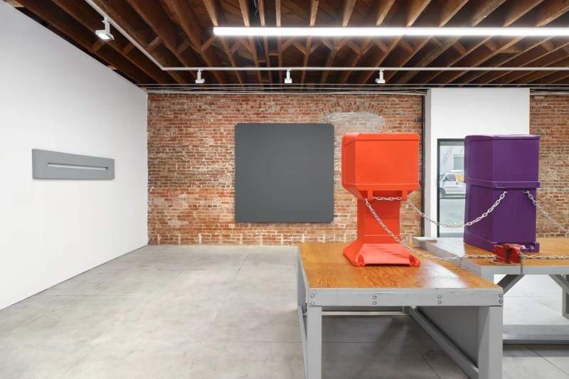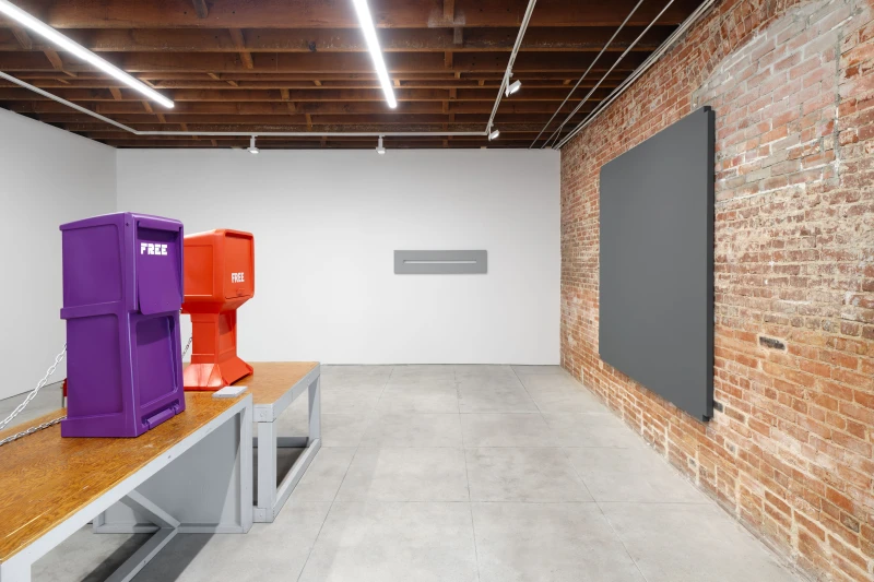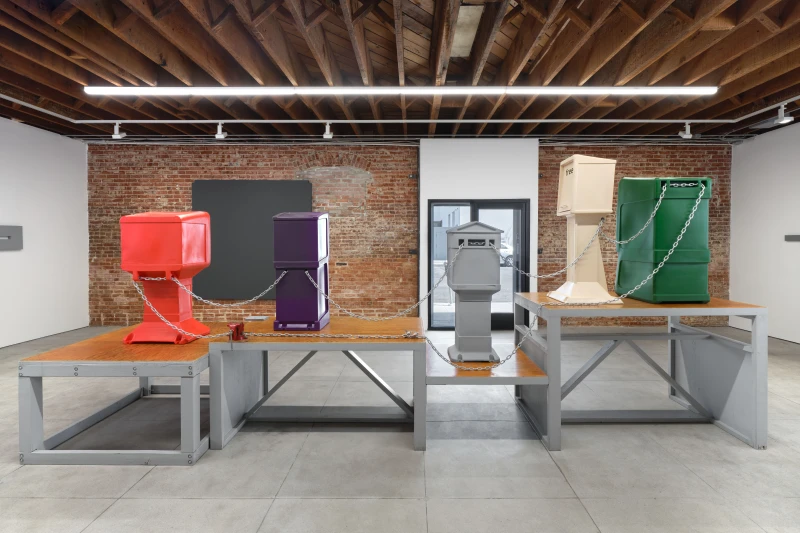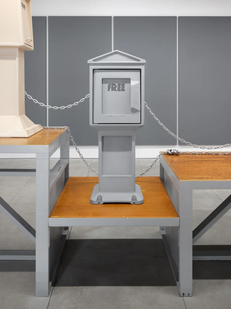 A display of monochromatic free newspaper distribution boxes, all 2025, Citizen (Free), Daily (Green), Insider 2 (Purple), Observer (Beige), and Sun (Orange), sits on a series of pedestals made of four worktables of varied heights from Rita McBride’s studio. The sculptures, which were removed from the street and painted to closely match their original color, stand as monoliths empty of information. Like much of McBride’s work, their meaning is responsive and mutable to the conditions in which it is displayed. They are a site of potential, nodding not only to shifting modes of design, but to a given form’s relationship to the public through both intended and actual use.